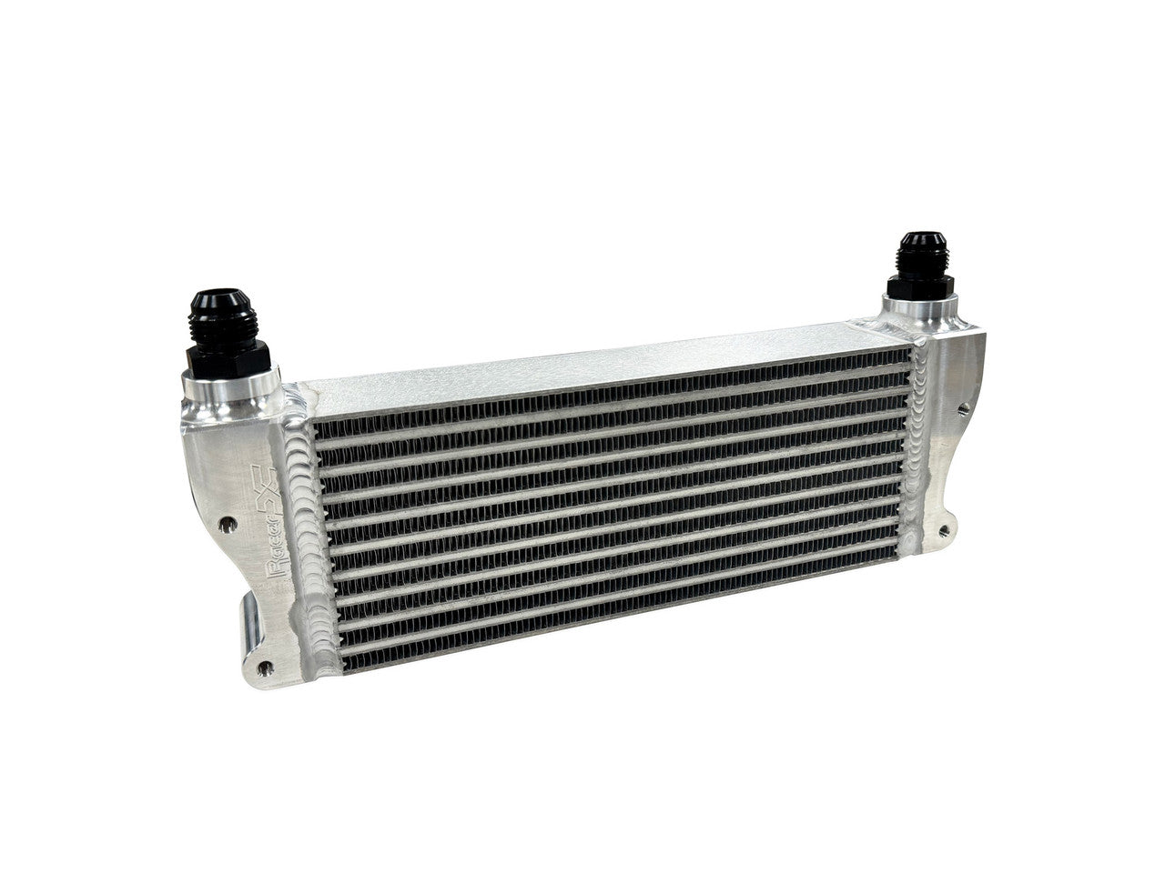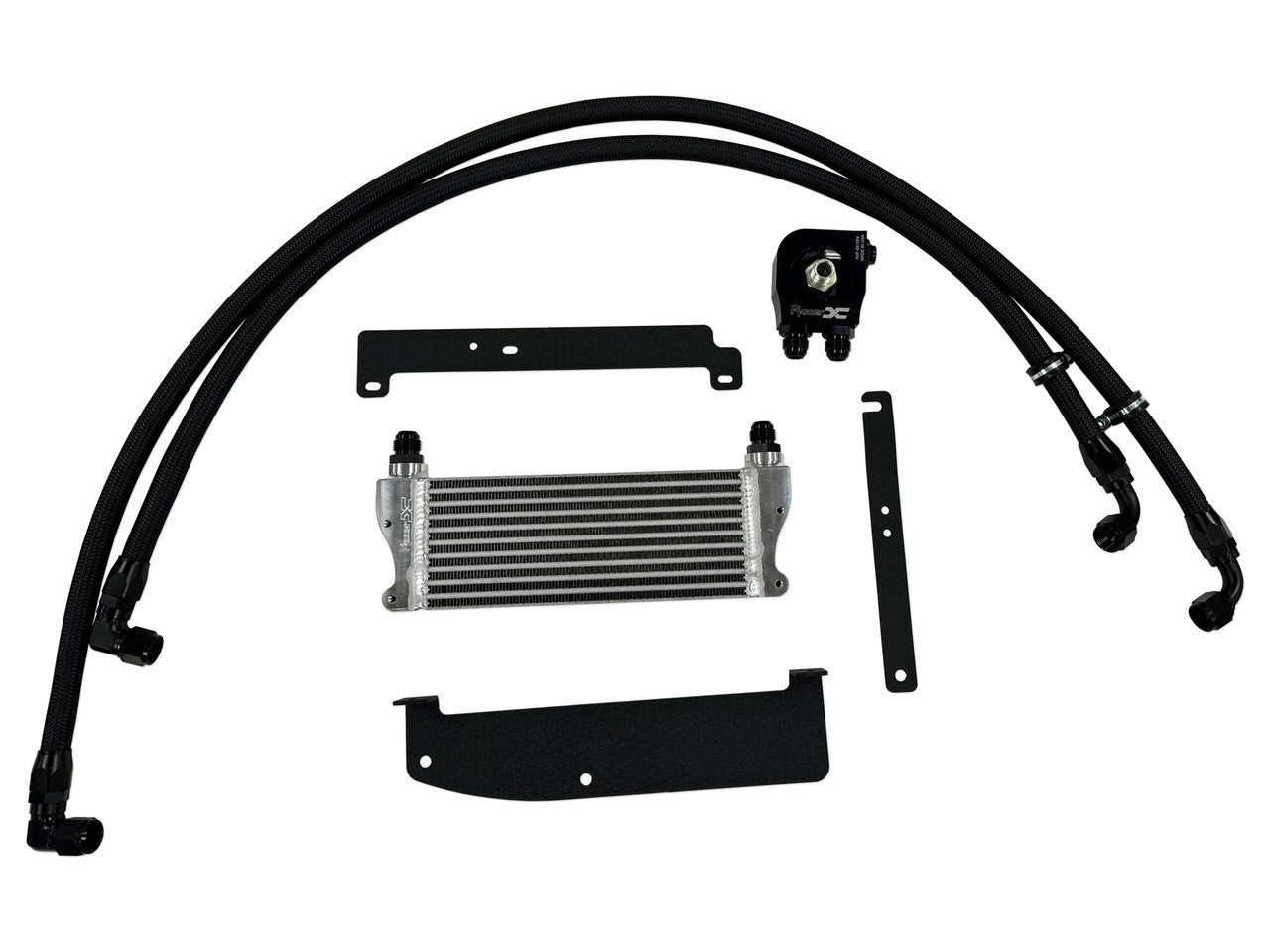 The Racer X Fabrication oil cooler for the 2023+ Toyota GR Corolla will keep high oil temperatures in check. The Racer X oil cooler kit is designed for autocross and track use -- typically not recommended for street use. Depending on location and summer time temperatures engine oil can exceed 250 degrees F, the oil cooler will help to reduce oil temperatures with optimal placement and an efficiently sized core. The oil cooler tanks are CNC machined from 6061-T6 aluminum and feature standard -10AN o-ring boss fittings. The kit includes the Racer X thermostatic adapter plate, which functions with the use of a wax thermostat. The oil cooler will be by-passed until the vehicle reaches operating temperature, once operating temperature is reached the thermostat will open and allow oil flow through the oil cooler. The Racer X oil cooler kit comes standard with -10AN pro lite hose/fittings and associated mounting brackets.