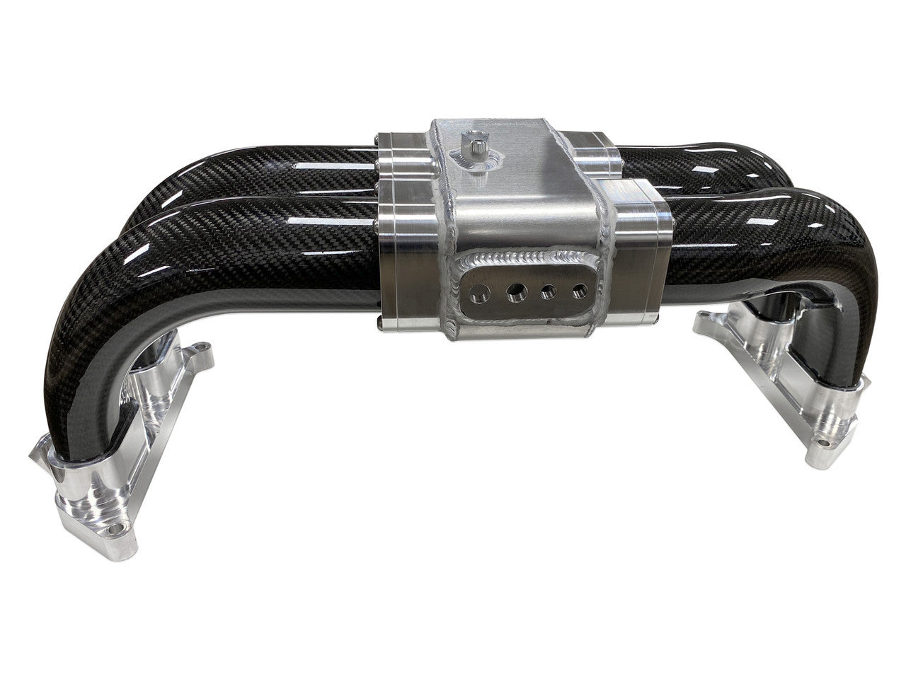 The intake manifold starts with our CNC machined cylinder head flanges that are designed from the OE CAD data and modified to increase air flow. The flanges work with the OEM fuel rails or aftermarket fuel rails. We use separate mounting brackets that allow for simple installation or disassembly of the fuel rails. The runners are mandrel bent and formed to match the cylinder head flanges and base plates at the plenum. The plenum is made from 5052 aluminum and formed to meet the base plates, as well as the throttle body flange. At the back of the plenum there are 4 NPT ports for vacuum reference. The base plates features tapered velocity stacks to increase air speed and smooth airflow into the runners. The complete manifold is TIG welded, and uses common size O-ring seals for the flanges and throttle body.