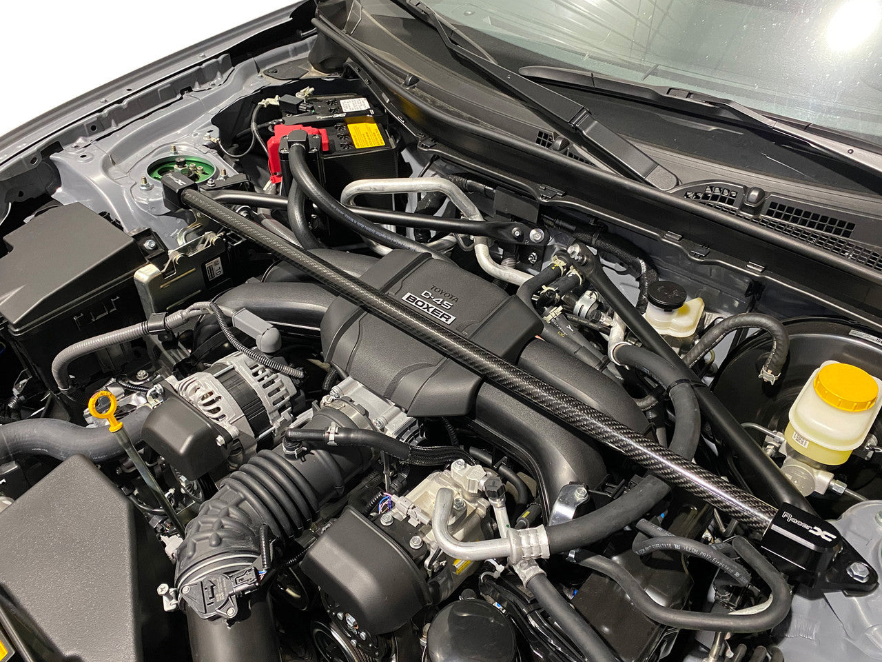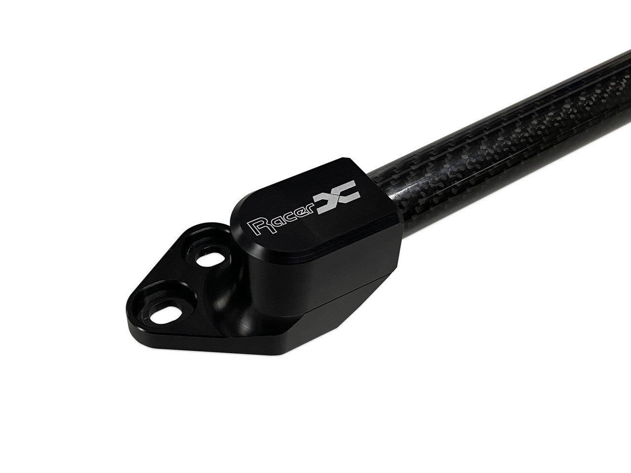 The Racer X Fabrication carbon fiber front strut tower brace for the 2022+ Toyota GR86 / Subaru BRZ was designed to reduce deflection between the strut towers commonly experienced during spirited driving or competition. The Racer X strut tower brace adds to the OEM braces and increases rigidity while improving steering response. The assembly is comprised of rolled carbon fiber tubing and CNC machined 6061-T6 aluminum mounts, making it lighter and stronger than many strut tower braces found on the market. The mounts are anodized black for corrosion resistance and appearance, and laser etched with the Racer X logo. The Racer X strut tower brace does clear the OEM intake manifold cover.